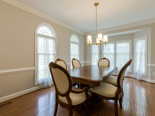 In the kitchen, we decided to refresh it rather than remodel. We kept the existing appliances and cabinets, but added crown molding. A new granite countertop and white subway tile backsplash brightened the kitchen, as did the new pendant light. A round glass table replaced the rectangular table and chairs, which were too big for the space.